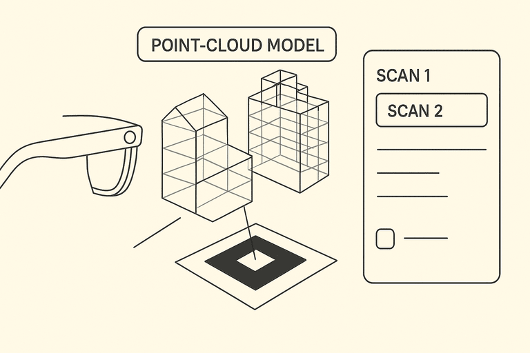 Build a Lens Studio Spectacles app to align multiple 3D point-cloud building models (or BIMs) to the real site using printed markers. Use marker detection to set a persistent world anchor, snap models to it, and enable runtime switching between scans/versions.